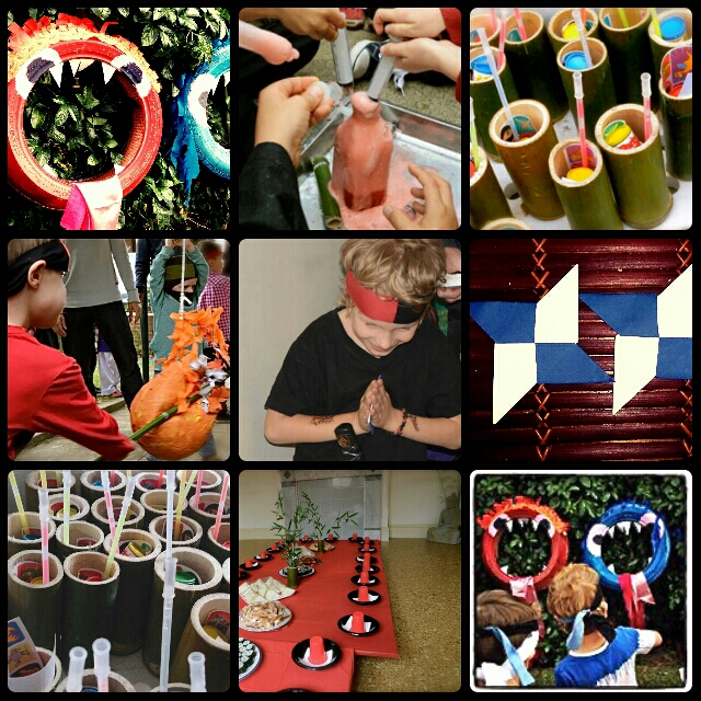 10.30am – All ninjas, now decked in red (fire dragon), orange (earth dragon), blue (water dragon) or green (forest dragon) team headbands line up in front of four brightly beckoning ninja demon mouths (daggy old tyres given a second (demonic) life). One by one, the ninjas defeat the yawning demons, breaking their evil chi by throwing an origami ninja star through their wide, grotesque mouths.