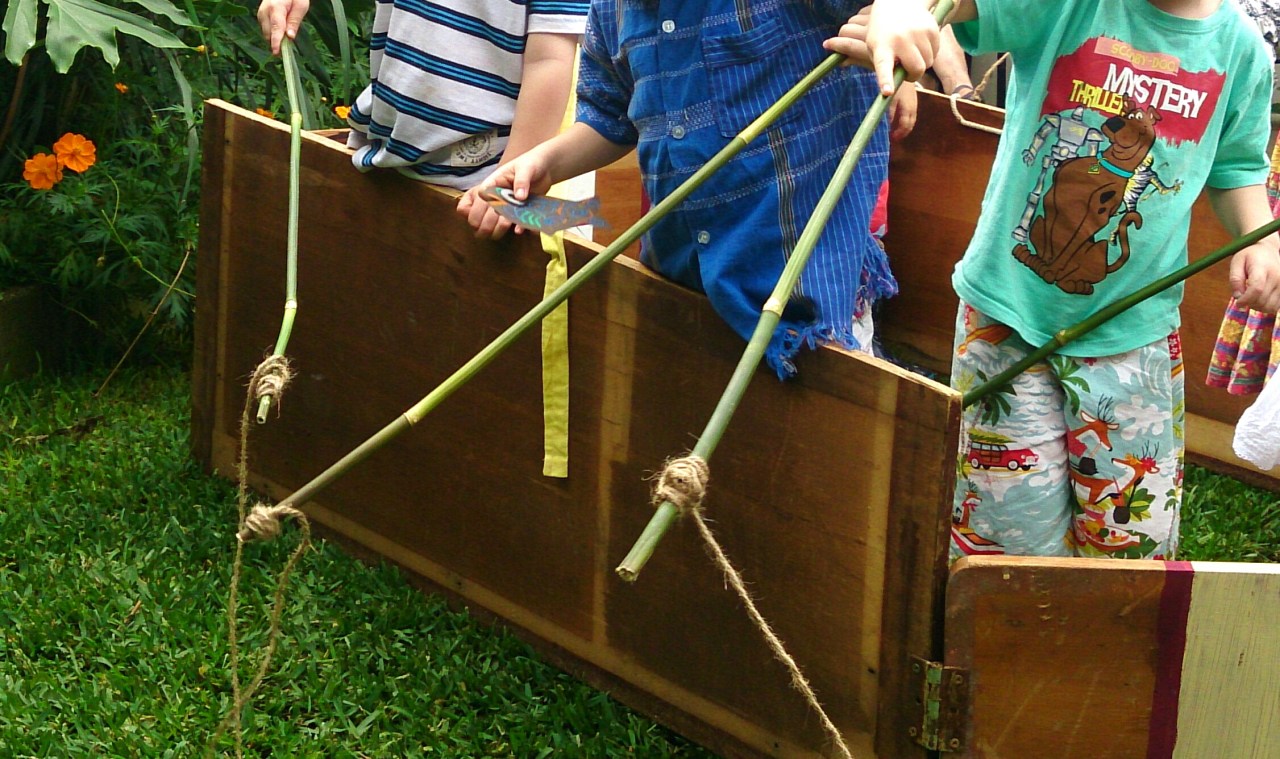 For the fishies, I cut out cardboard shapes of fish (you’ll need at least five per child), and set my children to work decorating them with bright crayons. Of course our fish weren’t all happy chappies – we ensured there were a few bitey specimens in there to churn the waters a little. A simple cheap washer added as an eye doubles as the magnetic spot for the waving fishing poles. I suggest a little dab of PVA glue to ensure the gobbly dobbly eyeball is firmly stuck.
