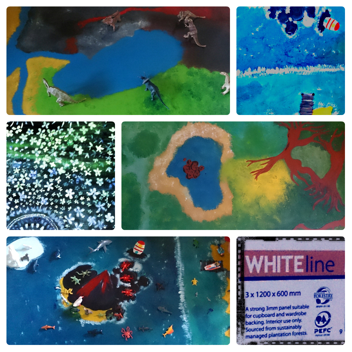 My boys are always begging me to make another floor scene with them. They love the journey into the hardware store to choose their wood; they happily wallow in deciding which elements are essential to their new scene (bird droppings on a rocky island or magic mushrooms sprouting from an old gum tree); they sponge their paintings out with ferocity and vigour; and once their scene is complete, they fall upon it with their animals and boats creating a magical world at their feet.